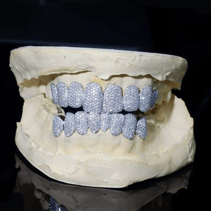 Individually molded Moissanite grillz with sterling silver or gold base, includes 3D design preview and fitting kit. Fully iced finish.